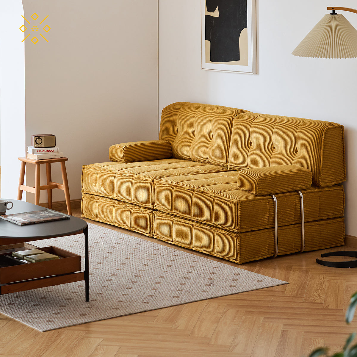 このレトロなマスタードイエローのソファで、あなたの自宅にビンテージなエレガンスをもたらしましょう。長さ93センチから280センチまでのサイズが用意されており、快適なシングルシーターから広々としたセクショナルまで、さまざまな着座ニーズに対応しています。耐久性の高い生地のアップホルスタリーで作られ、タフテッドデザインと丈夫なフレームが、長く快適な使用を保証します。くつろぐ用途やおもてなしに最適なこのソファは、ノスタルジックなスタイルと現代的な機能性を融合させています。